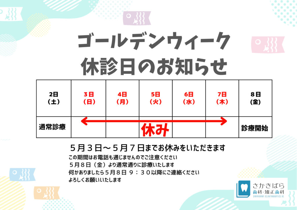GW休みのお知らせ 2026.04.27 💚スタッフからのお知らせ💚 こんにちは♬ 保育士のあみ先生です👩🏻 今回はGW休みのお知らせです🎏 5月3日~7日までGW休みをいただきます 8日より通常通り診察しますので、 何かありましたら、8日9:30以降に ご連絡ください☎ ご予約はお電話にて お待ちしております💕 電話:0569-59-2200 以上スタッフからのお知らせでした。 #さかきばら歯科矯正歯科 #ゴールデンウィーク #GW #半田 #休診日 #歯医者 #矯正歯科 #保育士 « 前の記事 おとなの歯科 こどもの歯科 0569-59-2200 Web予約 MAP